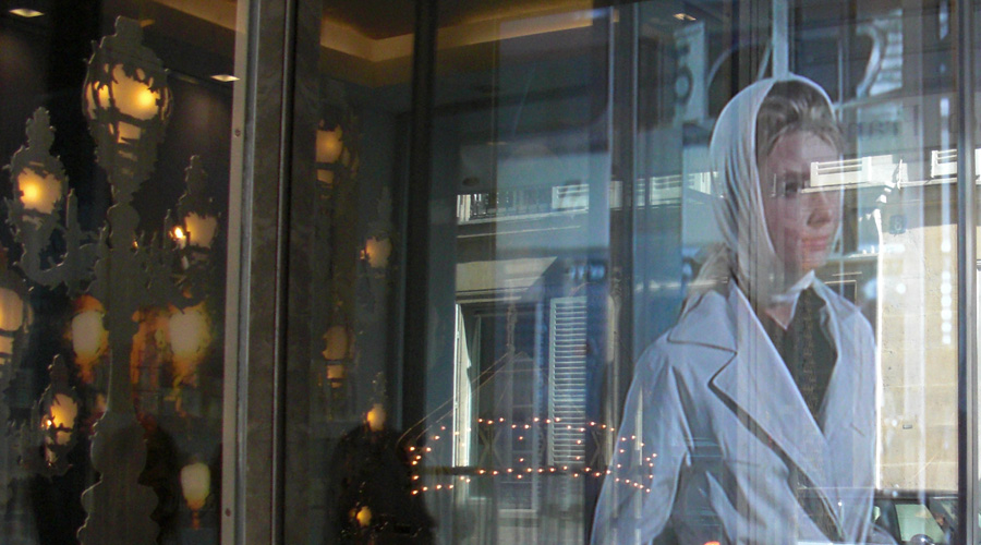 A gauche, sans avoir à entrer dans le magasin, a été aménagé un mini-passage parisien, une galerie derrière un mur de verre