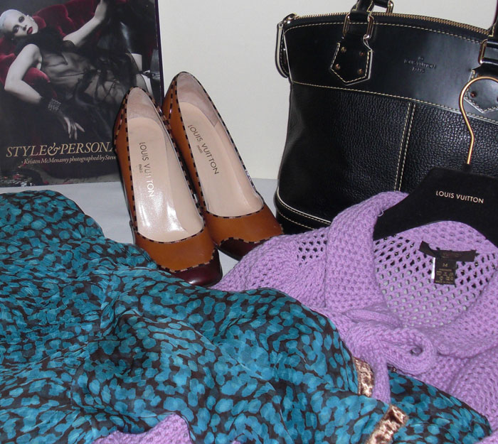 Vous avez bien vu : un sac, une paire de chaussures, une robe et un gilet. Du cuir suhali, des damiers années 40, de la mousseline de soie léopardée et du cachemire violet !