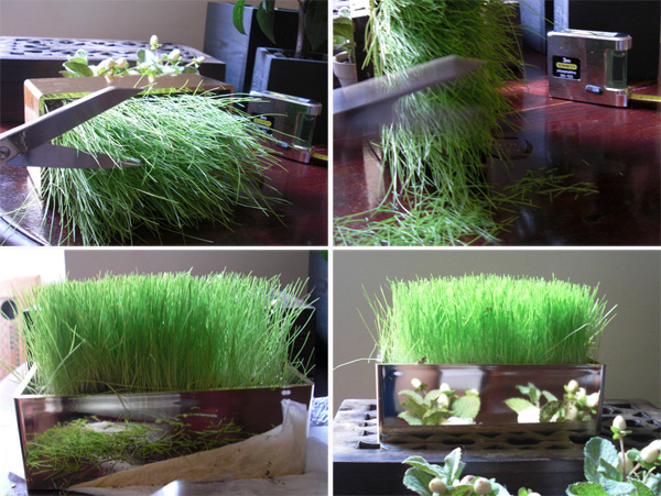 J+15 : Le carré de gazon mesure environ 8 cm. Pour le tonifier, placer le bas sur la tranche, coupez-le de 4 cm avec des ciseaux et brossez délicatement de la main pour éviter les résidus.