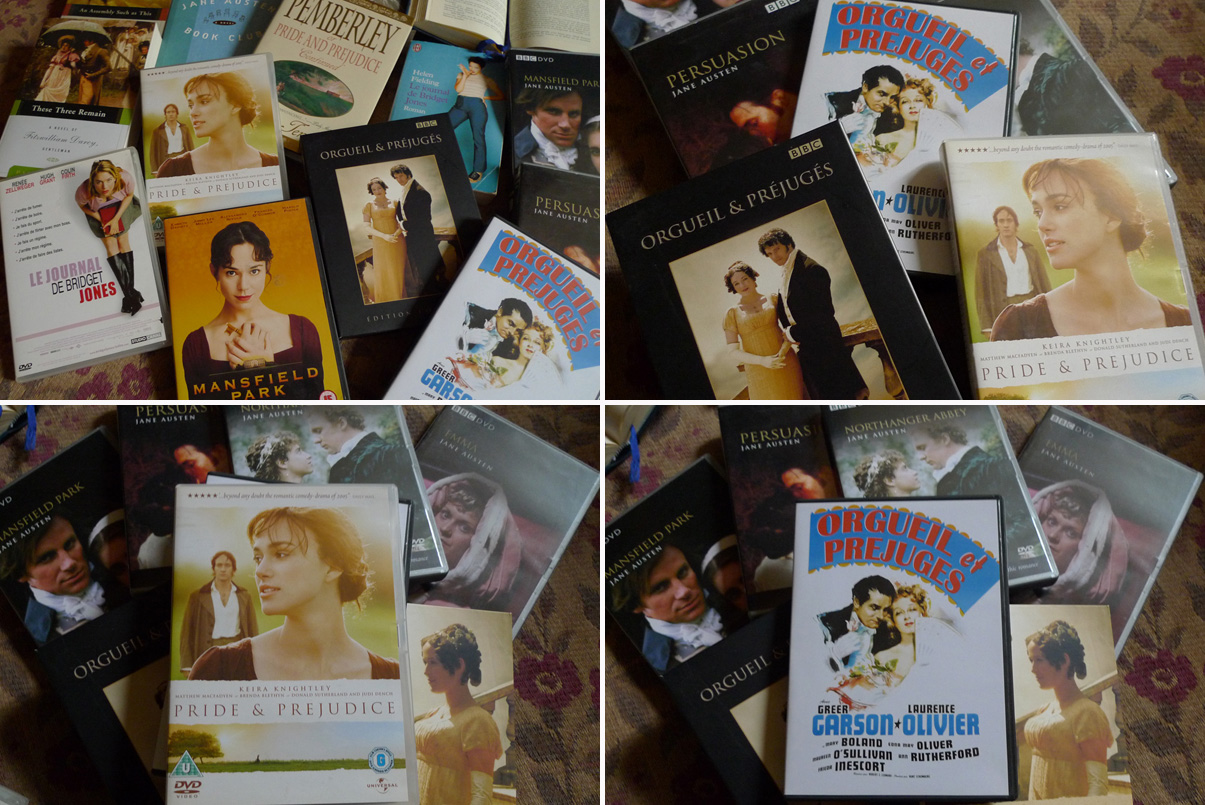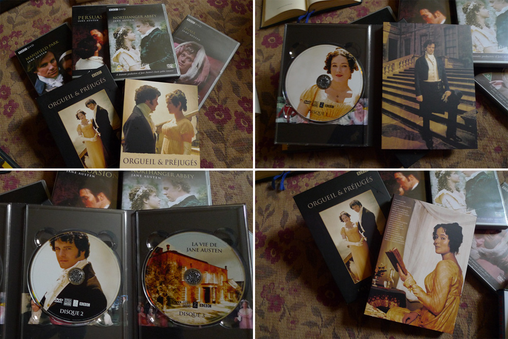 Il y en a eu d’autres depuis, de tous ses romans. J’en ai quelques unes. Une mention bien au passage pour 2 dvd qui sont absents de cette sélection car prêtés comme la plupart des bouquins : « Raison et Sentiments » d’Ang Lee, Emma Thomson et Hugh Grant en pantalon à coquille (???), sublime ! Mention aussi pour Gwyneth Paltrow dans « Emma », excellente.