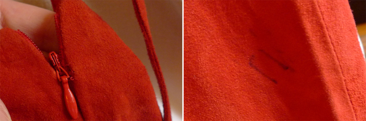–       le lien de cuir se termne par une fixation bretelle qui, pendue sur le cintre, a laissé une marque sur la peau, au niveau du genou gauche extérieur. Je n’ai rien fait pour cacher la marque sur aucune photo, elle ne se voit pas simplement… par souci d’honnêteté, j’ai zoomé dessus également. Probablement cela partirait avec une gomme à daim, mais je n’en ai pas sous la main donc je ne promets rien mais franchement ça n’est pas gênant, c’est tout petit.