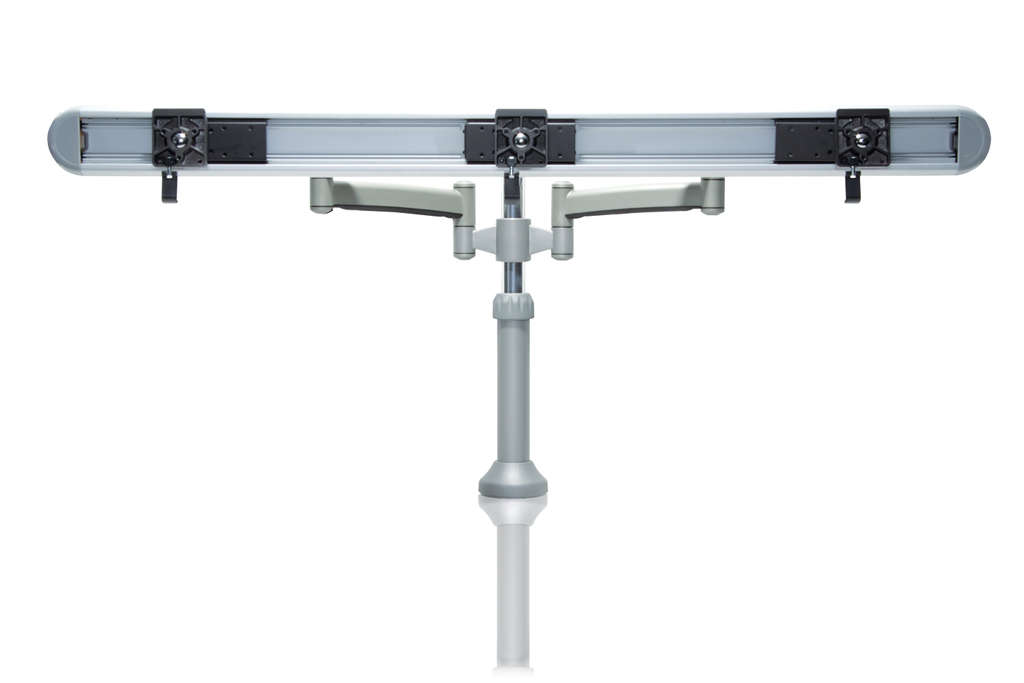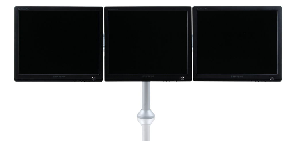 On peut améliorer un peu l’organisation avec des supports ad hoc, comme ceux fabriqués par Humanscale que vous voyez ici en version modeste (3 moniteurs, avec et sans les écrans) et en version démente (8 moniteurs).