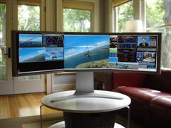 Tout pour plaire, au moins en apparence, la largeur de 3 écrans, la courbe permettant de ne plus avoir de cassure, ce serait parfait, si ce n’était une solution un peu étonnante. En effet, personne ne sait faire aujourd’hui de dalle LCD, LED ou Plasma courbe. NEC a donc mis 4 projecteurs DLP dans son écran, derrière une seule surface de projection translucide. Ils ont très bien fait les choses, ainsi que l’explique le monsieur de la vidéo ci-dessous: une seule alimentation, un seul cable vidéo DVI ou HDMI, pas de complexité technique pour l’utilisateur, sauf que la présence de 4 projecteurs rend l’écran un peu épais (c’est un euphémisme, oui), et mon petit doigt me dit que les 4 lampes nécessitent une ventilation non négligeable, rendant probablement l’objet un peu bruyant. Il y a également la question de la durée de vie des lampes, elles se compte en milliers d’heures, et les projecteurs DLP étant rarement en marche 10h par jour ce n’est en général pas un gros souci, sauf qu’à un tel rythme, même 5000 heures ne représentent que 500 jours, donc en gros deux ans de travail, et avec des prix de l’ordre de 200€ par lampe, je vous laisse faire le calcul du coût de maintenance.