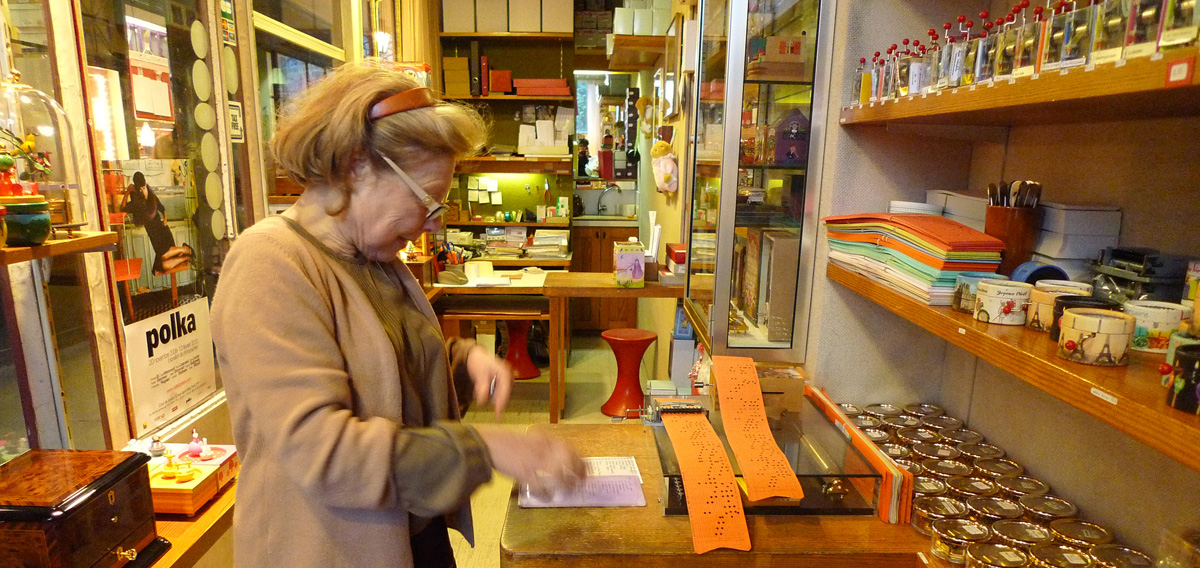 Elle tient une boutique de boites à musiques depuis 1962; elle occupait, avant, la boutique d’en face et occupe donc la boutique plus petite mais de même allure que l’on peut voir sur les photos d’Anne depuis 30 ans environ.
