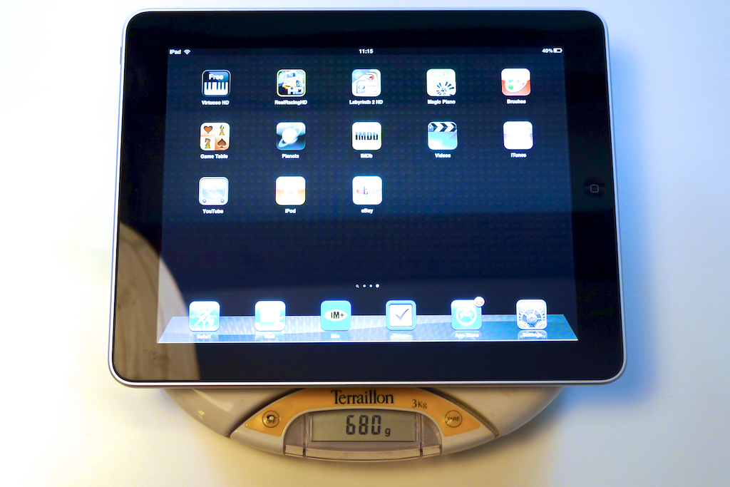 Avec ses 680g environ, l’iPad n’est pas vraiment plus lourd que beaucoup d’objets que nous sommes habitués à manipuler, mais ceux de poids équivalents sont généralement plus volumineux.