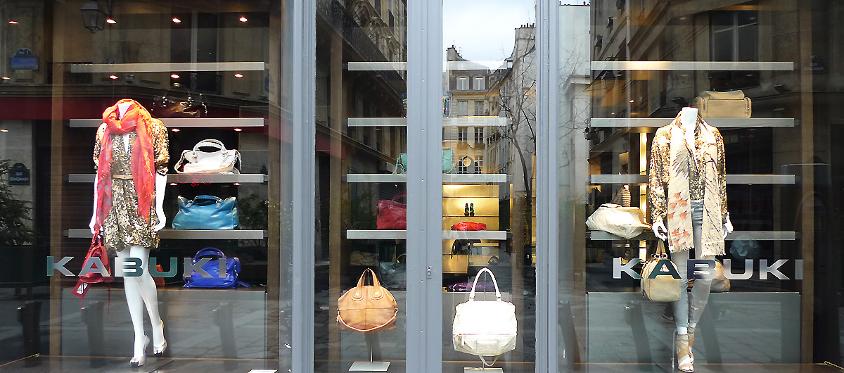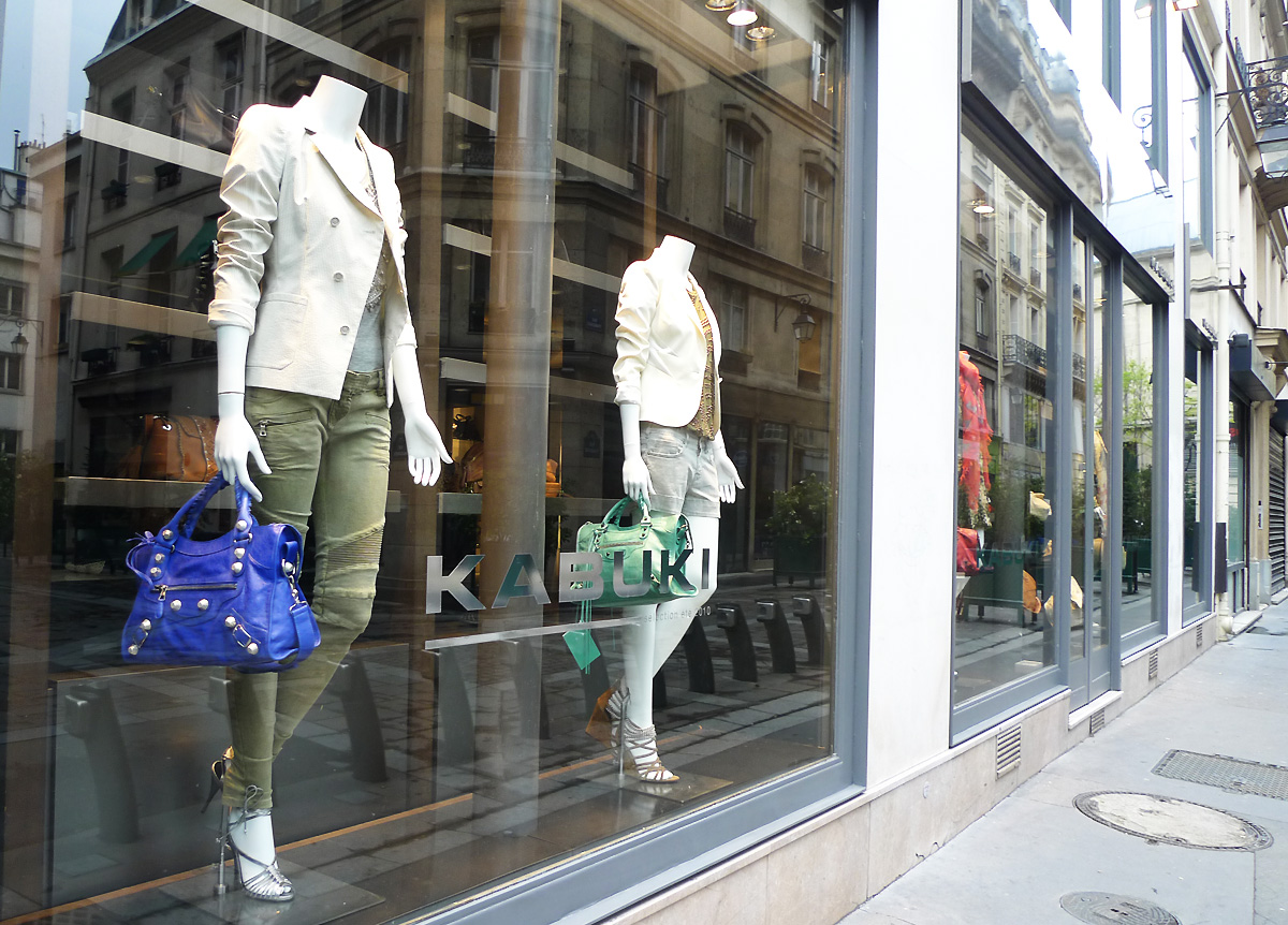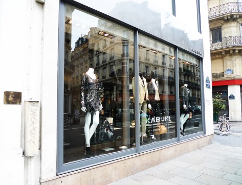 Aux numéros 21, 25, et 14 (rue de Turbigo, au croisement) se trouvent les vitrines et les portes des boutiques Kabuki, homme, femme et shoes.