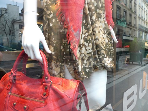 Le mélange des imprimés qui m’a fait craquer, c’est assez somptueux le chemisier ou la blouse façon camouflage et le foulard imprimé de branchages et plumettes. Pari hasardeux en effet que les mélanges mais vraiment réussi dans cette vitrine.