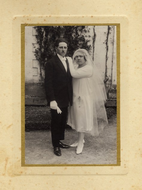 Ici le marié ne semble pas aux anges, que s’est -il passé ses souliers neufs le blessent ou la mariée a mangé des oignons crus au petit déjeuner ? Ils prennent la pose devant une belle maison aux volets clos, la maison des maîtres partis en villégiature ou la bella villa qui sert à tous les mariages ?