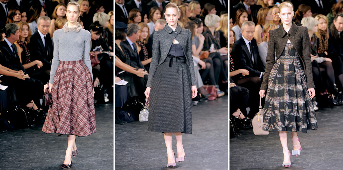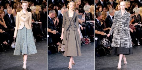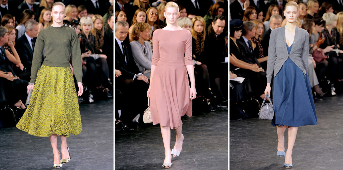 L’air du temps est à la nostalgie avec toutes ces robes et jupes corolles coupées dans le biais. J’y retrouve les 50’s et également l’élégance des 70’s. Même si la longueur et les gants sont très 50’s, la jupe en cuir blanc cassé le haut en dentelle et les souliers à noeud m’évoquent une Faye Dunaway dans Thomas Crown.