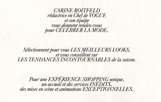Les invités auront la chance d’y rencontrer Carine Roitfeld, rédactrice en chef de Vogue Paris, ainsi que les rédactrices du magazine qui donneront leurs conseils en mode et de stylisme, pour une expérience de shopping unique et inoubliable. »