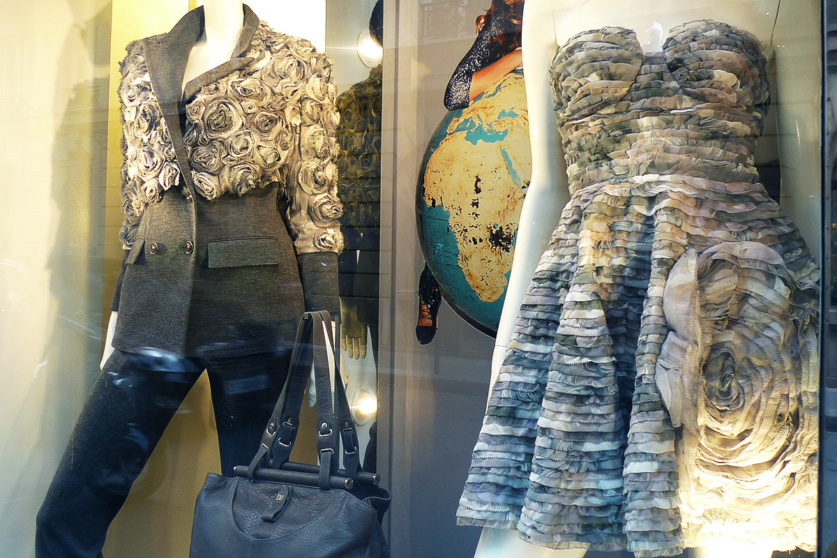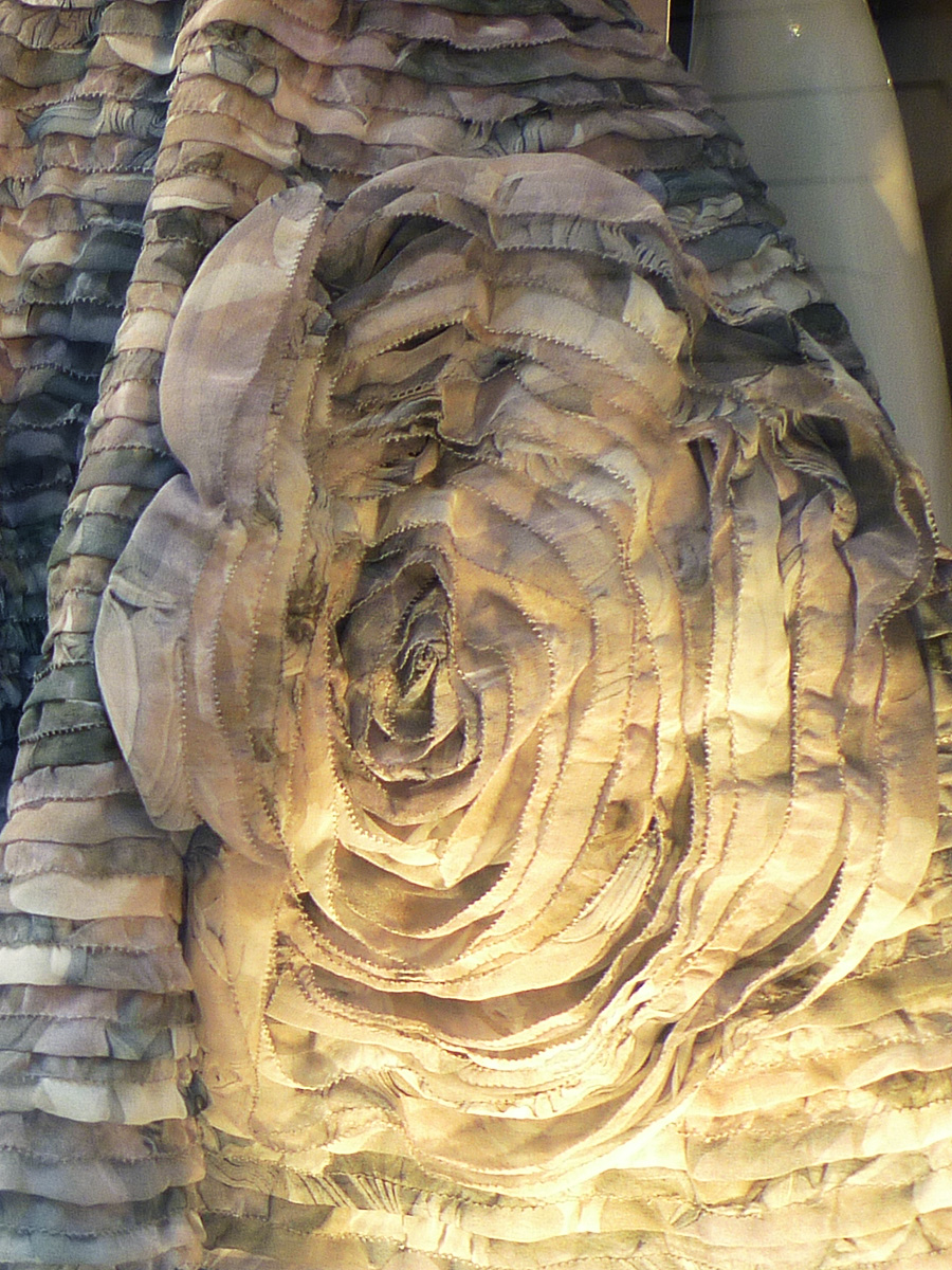 Ainsi, l’autre jour, j’avais craqué pour des fabuleuses fleurettes de soie sur veste militaire et énorme rose épanouie d’origami plié découpé vert de gris plaquée sur la hanche d’une robe bustier de milliers de minuscules volants en vitrine de Diane Von Furstenberg,