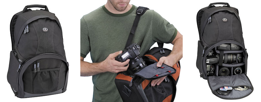 Les particularités de ce sac à dos, outre le fait d’être tout noir, sont d’avoir un compartiment spécial pour un ordinateur portable, un compartiment photo pouvant accueillir un boîtier reflex de type Canon 7D ou 5D sans grip additionnel avec un zoom conséquent (genre 70-200), deux optiques additionnelles et un flash. Un troisième compartiment vous permet de ranger accessoires, casse-croûte ou un oreiller pour la sieste. Enfin comme ces photos vous montrent, un accès latéral permet, sans poser le sac, en le faisant juste basculer vers l’avant tenu sur une seule épaule, de sortir l’appareil, vous permettant d’être prêt plus rapidement (et d’éviter de poser le sac dans une flaque d’eau):