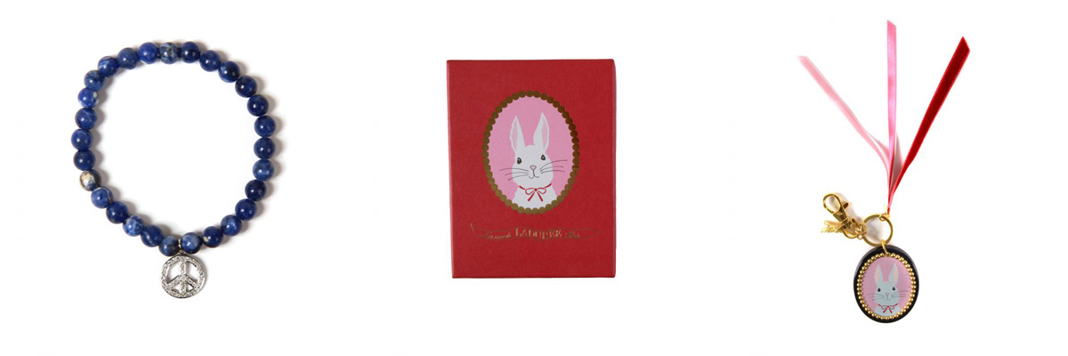 Des breloques : Bracelet Sydney Evan Peace en perles sodalites bleues, pendentif or blanc et diamants (715€) ou porte-clés Lapin Ladurée x Marks dans sa jolie boîte (40€)