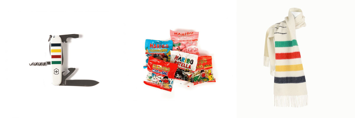 Des bonbons Haribo (5€ les 5 paquets) entourés d’un couteau de l’armée suisse (40€) et d’une écharpe en cachemire (100€) Hudson’s Bay
