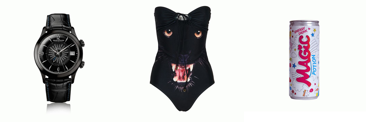 Une montre noire qui passe inaperçue mais représente le luxe total, Jaeger LeCoultre x CDC, Master Memovox Colette (12000€), un maillot de bain qui rugit We Are Handsome (165€) et la potion magique qu’il faut pour affronter ces deux-là, boisson énergétique Magic Potion (3,50€)