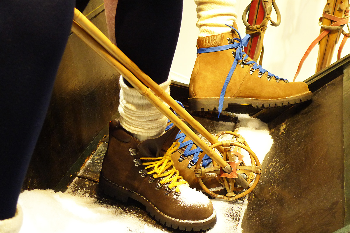 1. Ide a flashé sur les chaussures de marche aux lacets fluo, et moi sur les bottes de cuir enchassées d’un enforme en bois. C’est agréable ce côté gentleman montagnard.