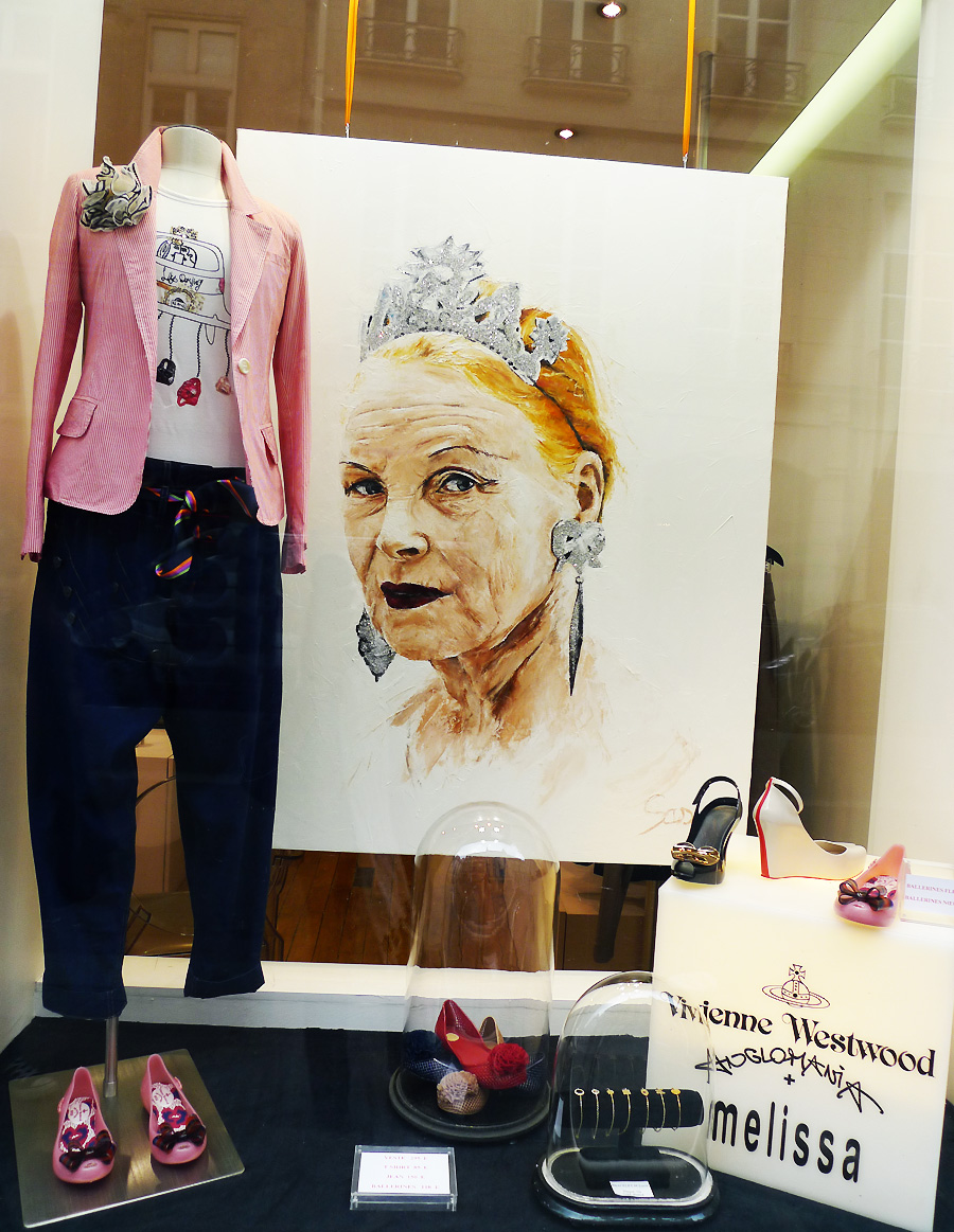 Seulement je n’ai pas pu. Du coup, je sors quelques photos prises cette semaine dans la rue des Petits Champs, une vitrine improbable pour une petite boutique devant laquelle je ne m’étais jamais arrêtée, consacrée à une autre Vivienne, Madame Westwood.