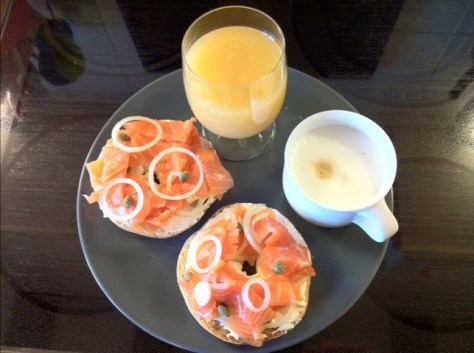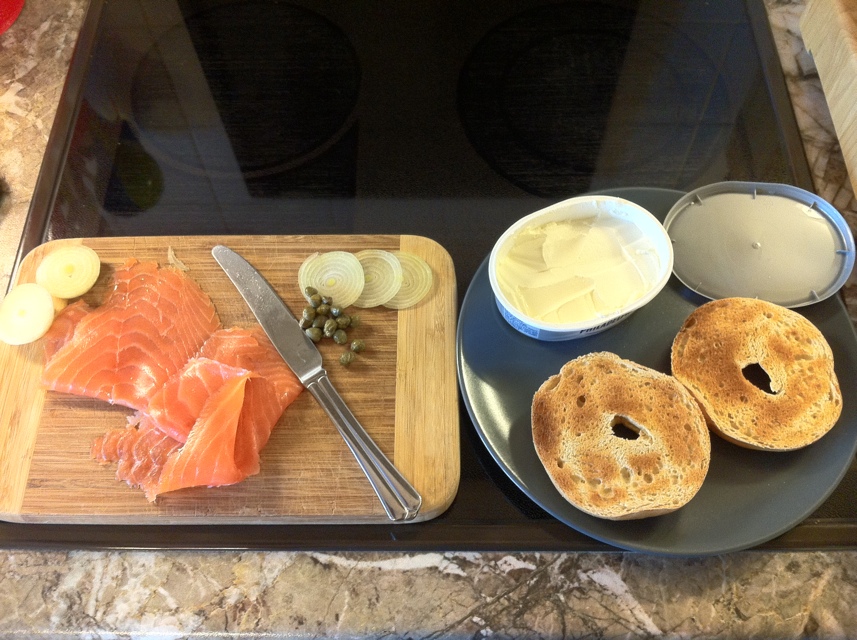 Concernant la marche à suivre, rien de plus simple: coupez en deux le bagel, passez-le au grille-pain, tartinez le de fromage, puis disposez quelques lamelles d’oignon, quelques câpres et le saumon.
