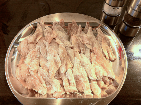 La première étape, consiste à saler et poivrer les filets, puis les fariner. Il faut savoir qu’il y a deux écoles, avec et sans farine: j’ai testé les deux, et si j’ai un faible pour la version sans farine au restaurant, celle avec est un peu plus facile à cuire à la maison.