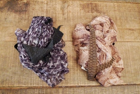 Et aussi des foulards… étonnants. Imprimés python sur mousseline de soie, ils sont légers, triangulaires et ont les pointes en véritable python.