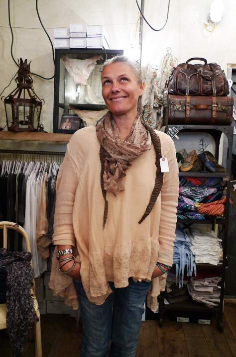 Yaya m’attendait devant sa boutique, souriante, bronzée, en tunique poudrée, si épanouie et jolie que j’en ai oublié les jambes lourdes et cliqué cliqué sur mon petit Panasonic, sorti de son étui Leica, à lui faire rendre l’âme (il tient bon mais pour combien de temps ? je commence à flipper).