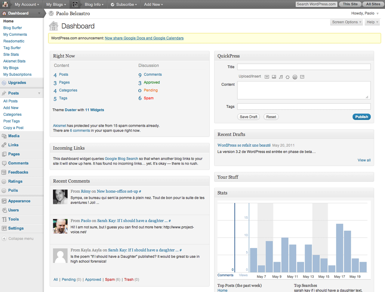 Ah, j’allais presque oublier: si vous avez envie de tester les nouveautés de WordPress 3.2 mais pas envie d’installer la version beta, sachez que depuis hier après-midi cette version a été déployée sur WordPress.com et que vous pouvez donc l’essayer gratuitement là bas.