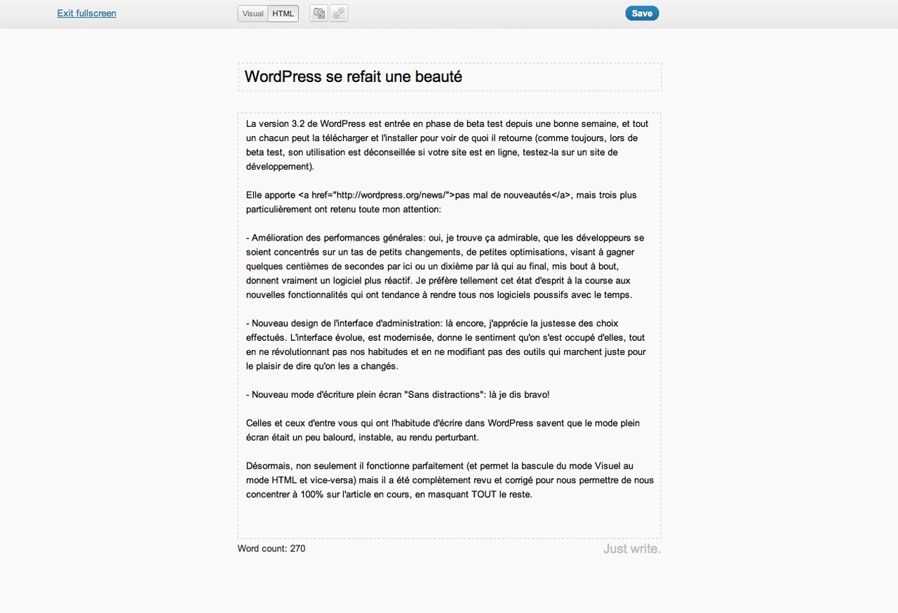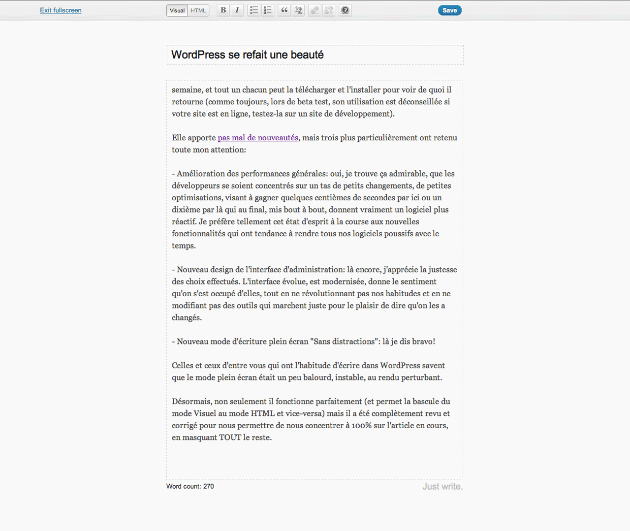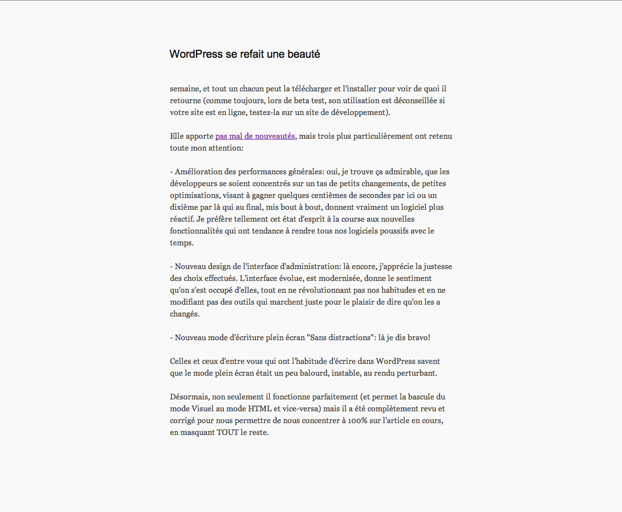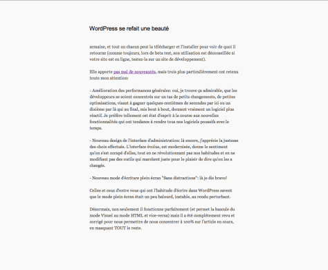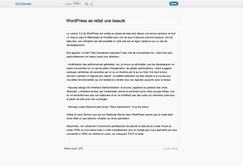 Désormais, non seulement il fonctionne parfaitement (et permet la bascule du mode Visuel au mode HTML et vice-versa) mais il a été complètement revu et corrigé pour nous permettre de nous concentrer à 100% sur l’article en cours, en masquant TOUT le reste.