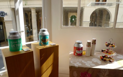 Les thés Kusmi nous ont offert du thé glacé à volonté, des boites rondes très jolies, sur l’imprimé Kenzo de Magali