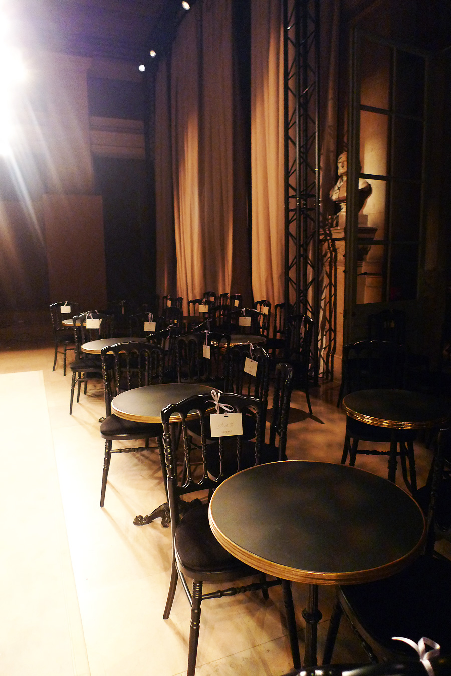 Constance papillonnait avec grâce et force sourires, les invités du défilé de 20h quittaient la place pour nous la laisser, chassé-croisé des défilés, organisation meilleure qu’à Saint-Jean de Luz en pleines vacances de février, stand champagne dans la cour faisant office de relai routier à double sens des fashionistas.