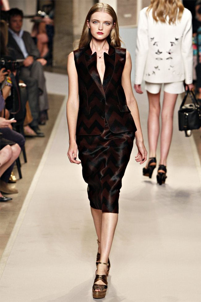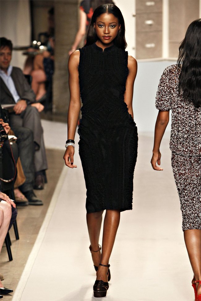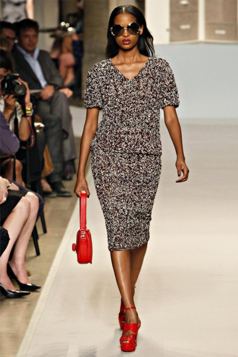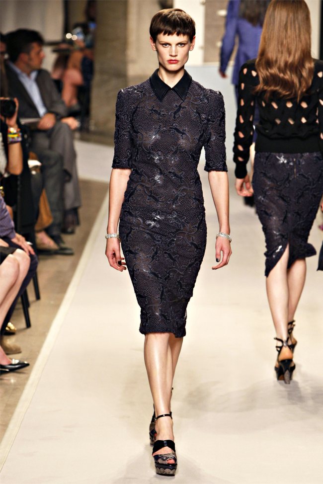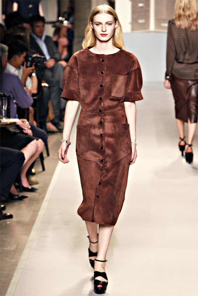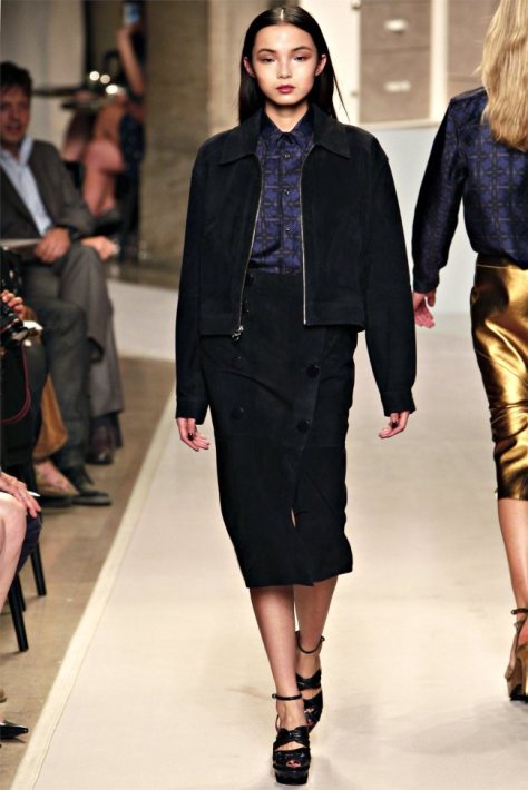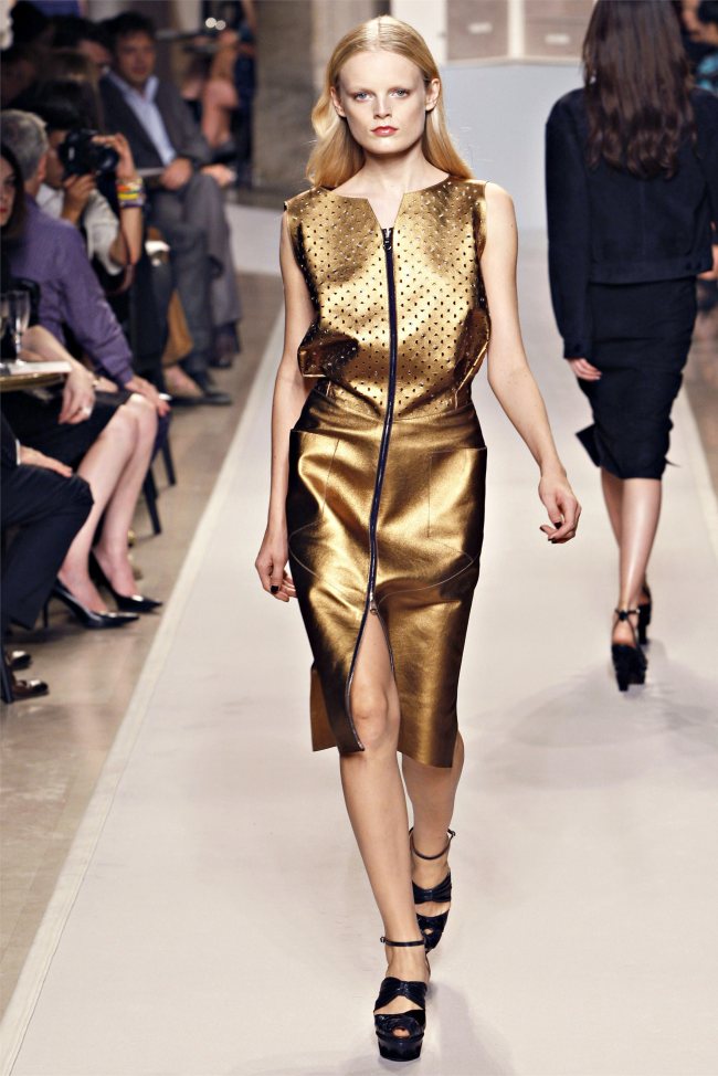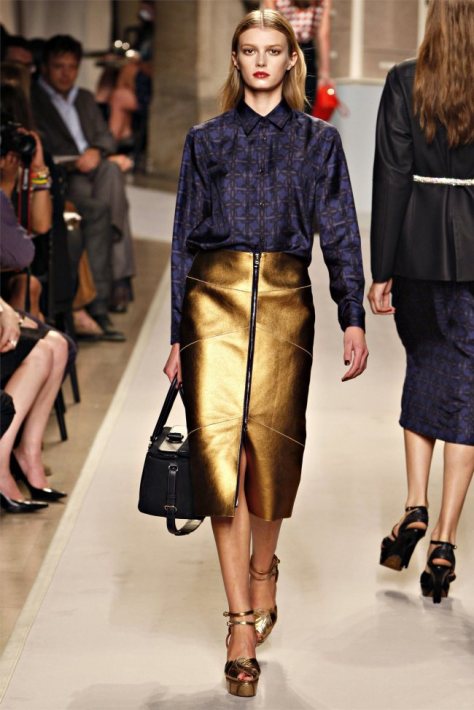 Puisque vous le demandez, mon coeur chavire entre les imprimés soyeux chics en diable et la robe zippée devant en poulain, so sexy… ou bien les bandes de cuir sur guipure… 2, 5, 8, 15… la robe noire parfaite en 26 ou bien du doré 34. OU encore les mélanges, satin en top, jupe daim grise… pfff…