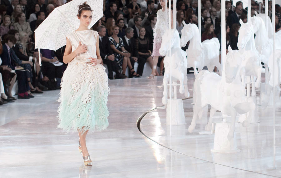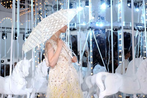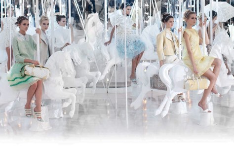Tout est féérique: le manège, les robes, la mise en scène. J’ai juste une grosse angoisse en voyant les chaussures: le printemps 2012 verra-t-il le retour de la mule ? Non, pitié, pas ça.