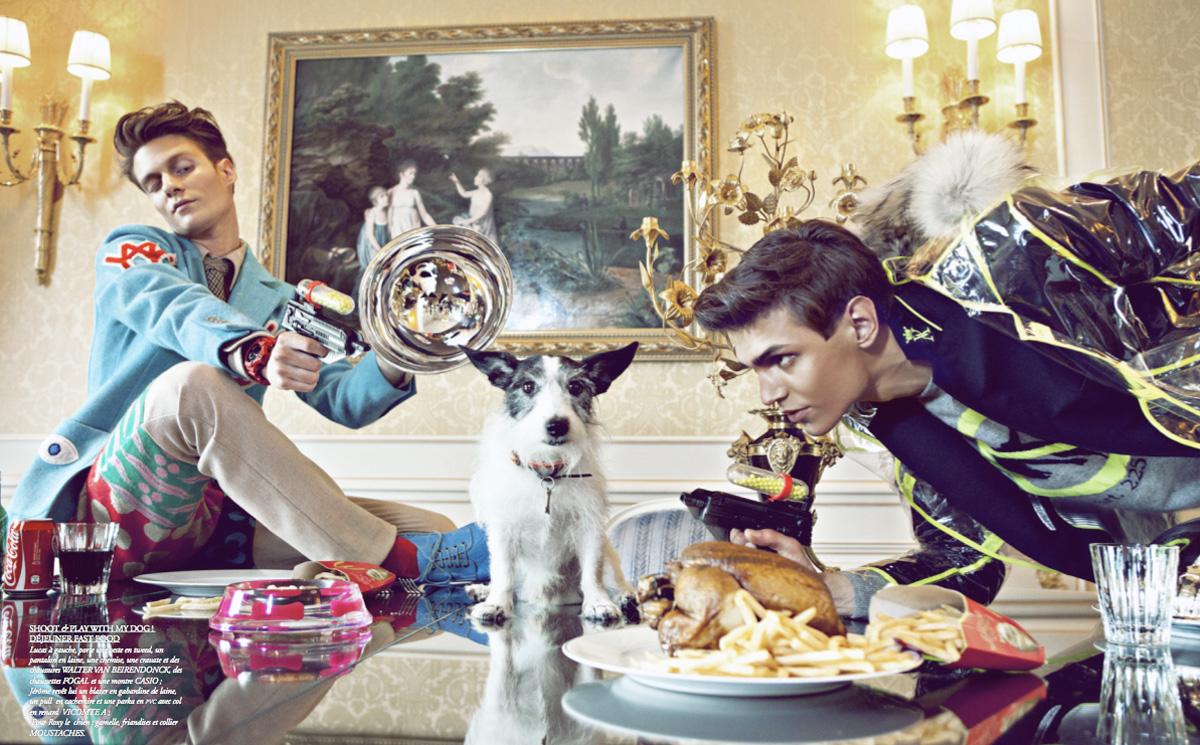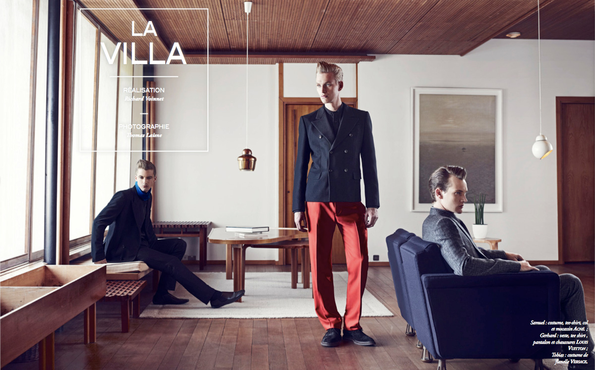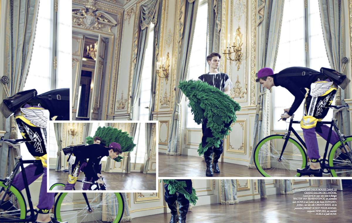 Un chapitre est consacré à la Beauté, secteur encore trop étranger à une gente masculine qu’on doit doucement apprivoiser (soins selon l’âge et parfums, chevelure disciplinée ou en vrac (NB: songer à montrer tout ça à Fred…) et conseils édifiants pour se sculpter un corps de rêve). Le sujet principal reste la Mode, avec des séries très belles aux images léchées et originales, réalisées par Richard Voinnet, Thomas Laisne pour photographe, classiques comme « La Villa » ou « Winter Tones », puis Jean-François Gschwindt, qui shoote plus jeune ludique, escrimeurs et bataille d’eau froide dans « Too Young To », où l’on retrouvera les ailes de Jeremy Scott pour Adidas…