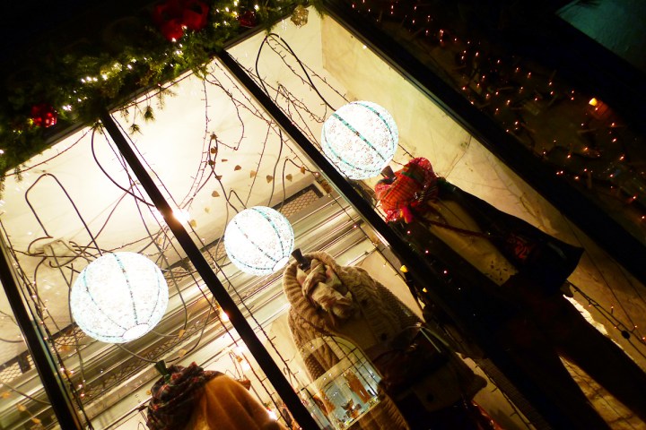Pour l’occasion, la vitrine a revêtu sa panoplie rouge et verte et elle brille dans la nuit qui tombe si tôt.