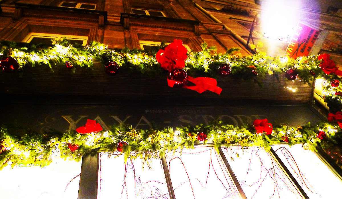 Pour l’occasion, la vitrine a revêtu sa panoplie rouge et verte et elle brille dans la nuit qui tombe si tôt.