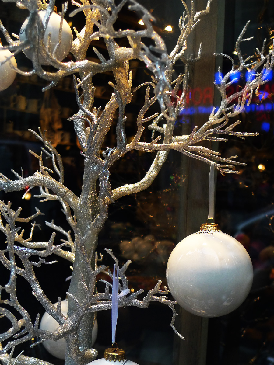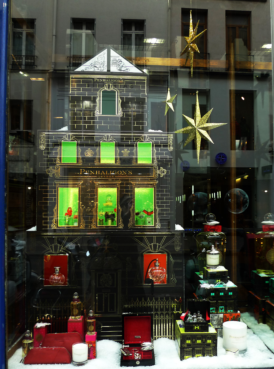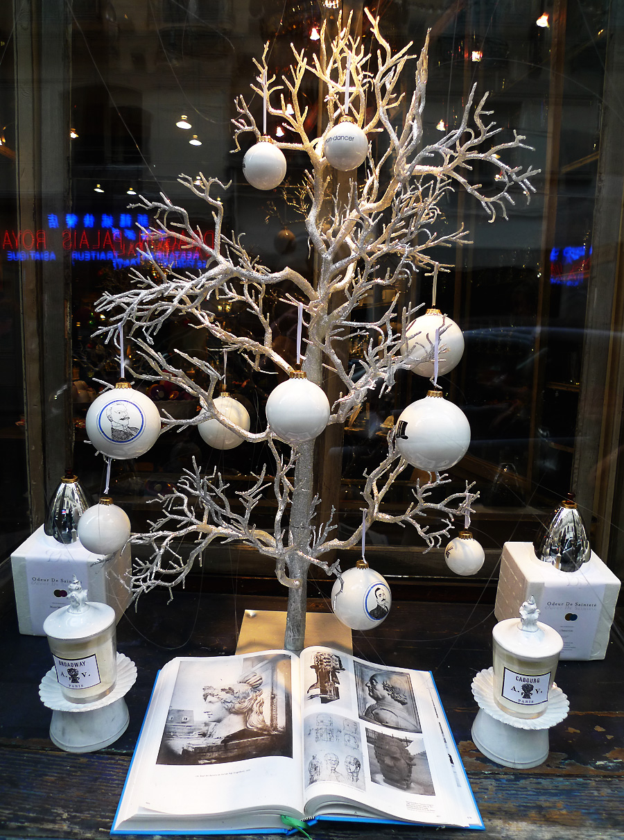 Mais maintenant plus d’excuses pour ne pas s’extasier devant la minuscule vitrine de Fragonard, exemplarité de déclinaison du classique de Noël, sapin vert en tête et en bois peint.