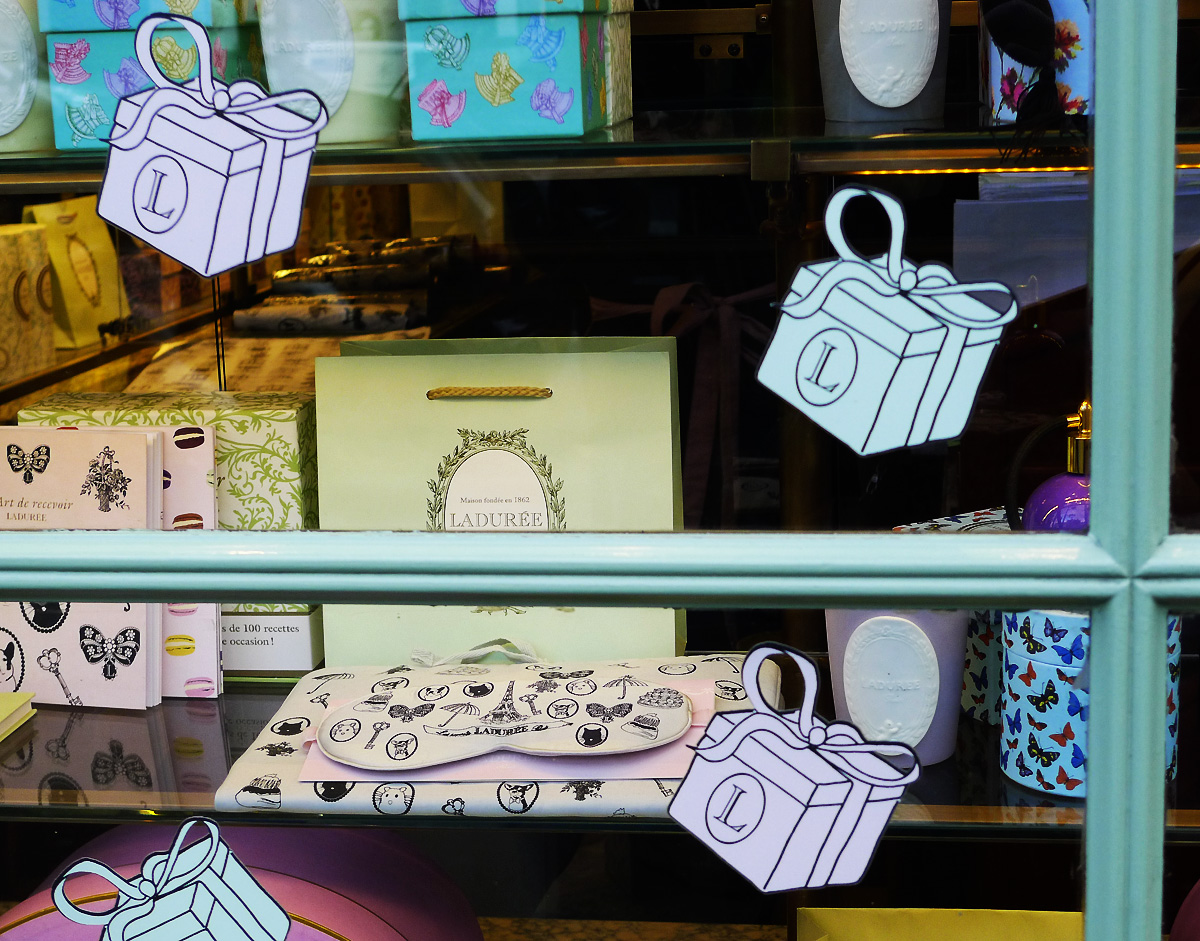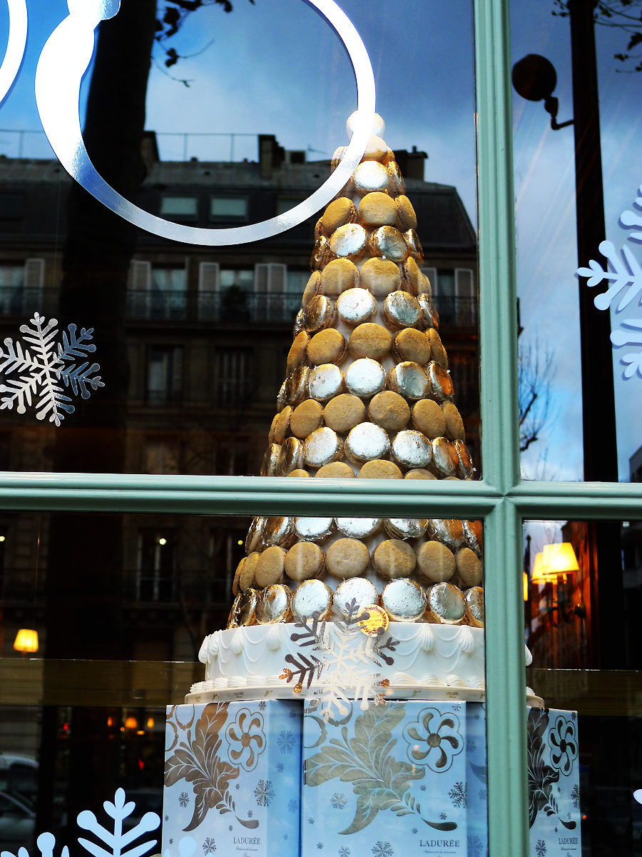 Déjà, on va la prendre à rebrousse-poil, cette rue, de chez Ladurée à Pyramides, ça donne en résumé… une seule image : LA Pyramide de macarons de Noël assortis Ladurée, spéciale dédicace à la gourmande qui en voulait plus hier.