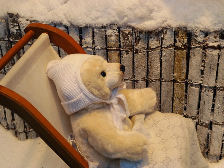 Entre l’ourson de la voisine qu’est enrhubé, pleure et renifle (peut-être mais il a une écharpe qui guérirait ma bronchite en moins de deux par -2°)