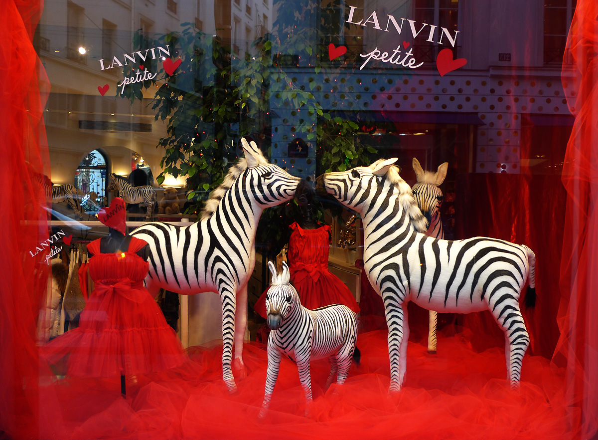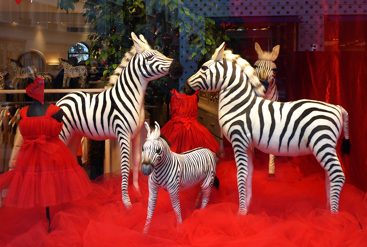 Papa Zèbre et Maman Zèbre cousent et lèvent la tête pour se rouler une pelle, vitrine pleine d’amour…