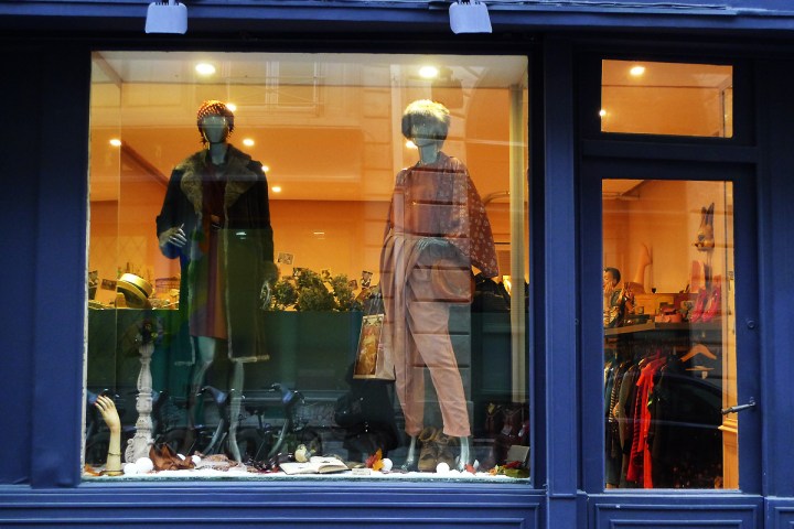 Donc, je longeais la rue d’Aboukir vers la Place des Victoires, quand soudain, face aux girafes de Shindo (l’article, l’endroit surtout, valent le détour alors je vous le remets en lien), et pas loin des lions, des tigres et des panthères (idem), une nouvelle boutique, sans enseigne, attire mon oeil par sa vitrine à la mode d’autrefois, à ma mode à moi.