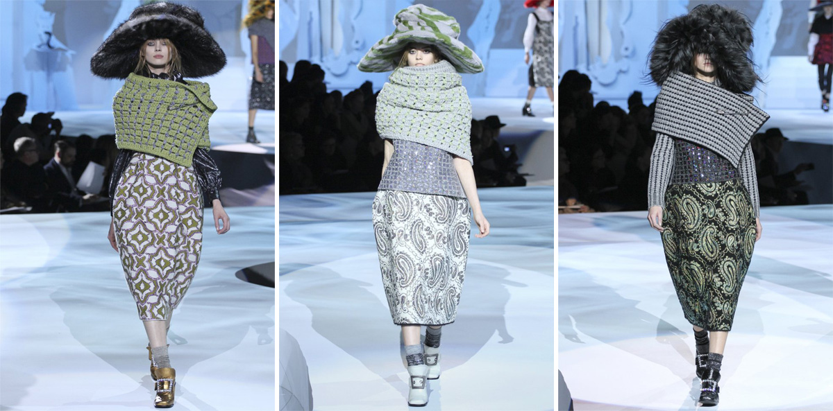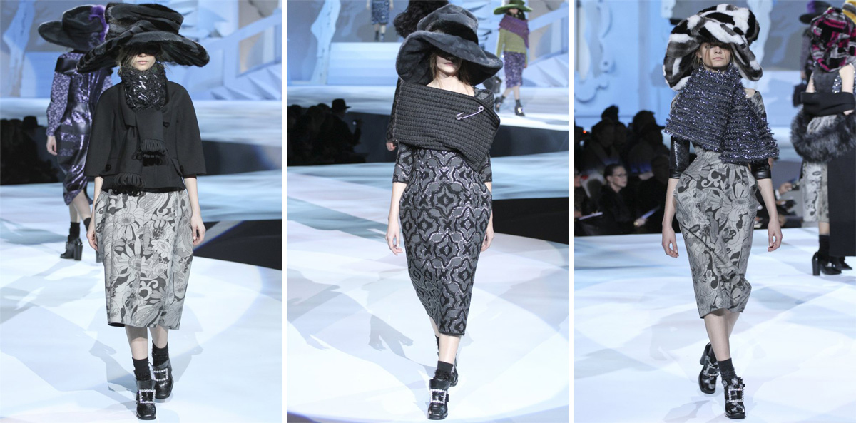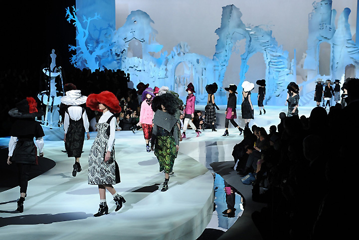 Il a embauché Yamamoto cette saison non? En fait, ça a TOUT d’un défilé Yamamoto, à une énorme différence près: une fois les chapeaux et les châles enlevés, on tombe sur des pièces parfaitement mettables, et je pense (il faudrait essayer) très valorisantes. Et ces sorcières new-yorkaises me font terriblement penser à Helena Bonham Carter dans Big Fish. Quelquechose de frais, quelquechose de poussiéreux, quelquechose d’inquiétant, quelquechose d’enfantin, quelquechose de chic….. Trop d’adjectifs me viennent. Et ce décor incroyable (je ne sais même pas comment ces montagnes de papier peuvent tenir debout)! Je pense qu’il va bientôt faire un film. Tout y est, le décor, la caméra, les personnages, les costumes, ne manque plus que la trame narrative.