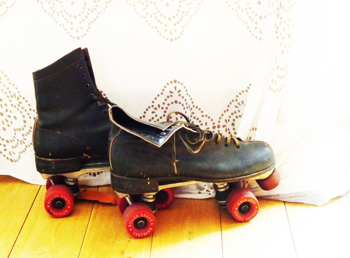 Pendant qu’il feuilletait et qu’on parlait, j’ai fait le tour du propriétaire en appréciant chaque détail de l’ambiance, inspecté avec curiosité les petits objets qui nourrissent la créativité de mon génie personnel, des vieilles boîtes fleuries aux affiches tuto afro, des rollers du 44 à l’assemblage d’images, de cartes, de tissus, de bouts de trucs… son mur d’inspiration.