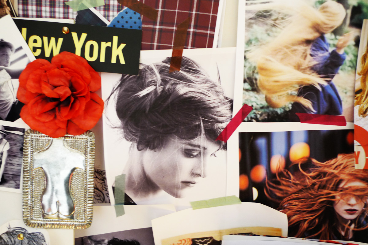 Pendant qu’il feuilletait et qu’on parlait, j’ai fait le tour du propriétaire en appréciant chaque détail de l’ambiance, inspecté avec curiosité les petits objets qui nourrissent la créativité de mon génie personnel, des vieilles boîtes fleuries aux affiches tuto afro, des rollers du 44 à l’assemblage d’images, de cartes, de tissus, de bouts de trucs… son mur d’inspiration.