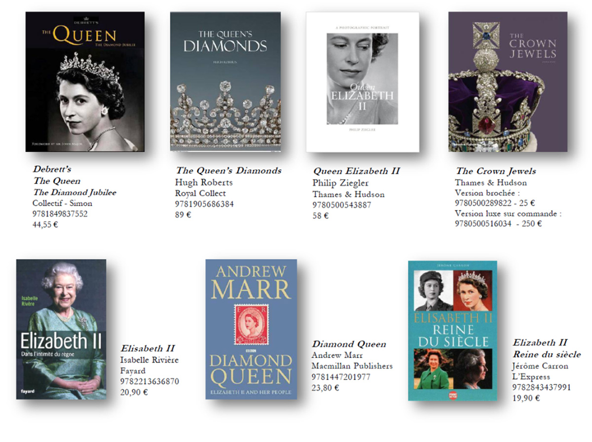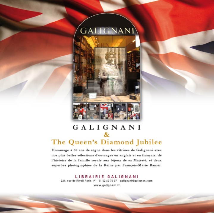 Edit : Galignani, la très chic et très belle librairie anglaise à Paris, nous offre de jolies vitrines dédicacées au jubilé de Diamant de la Reine, ainsi qu’une sélection de livres pour l’occasion : ça se partage !!!