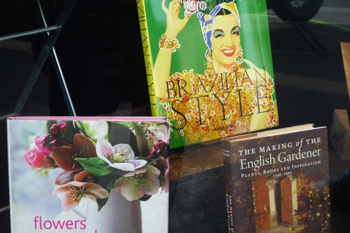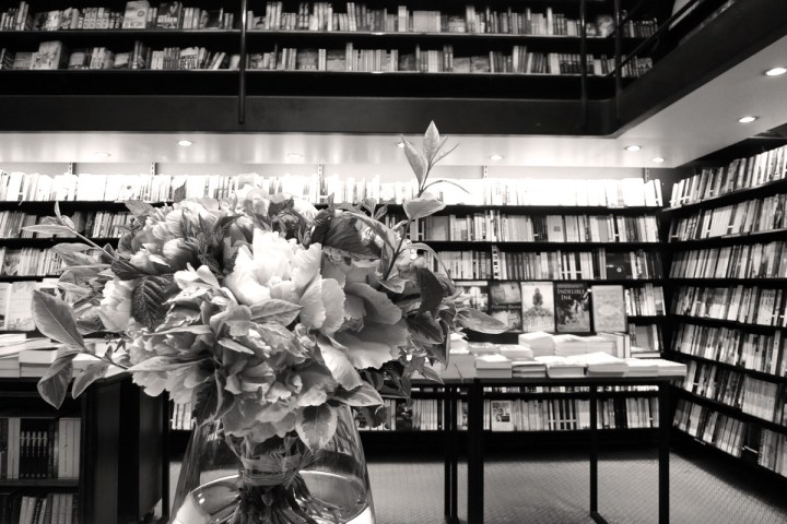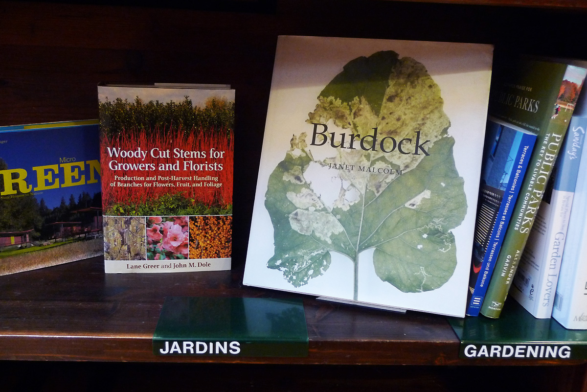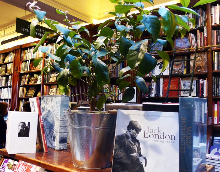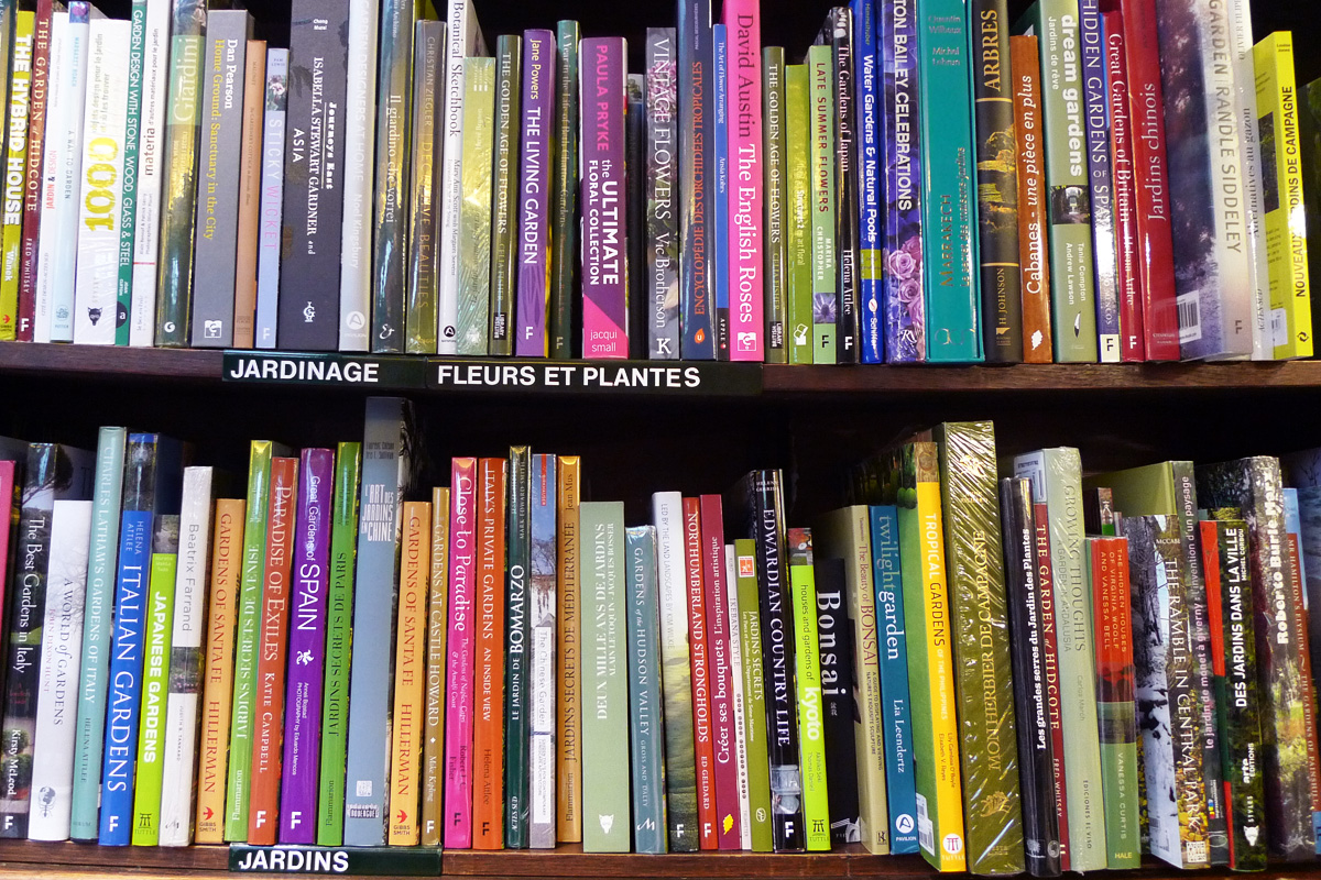 Dans la grande librairie que j’aime, se mêlant agréablement au bois patiné des étagères et du parquet, la verdure a envahi l’espace et semble apprécier la lumière qui descend de l’immense verrière…