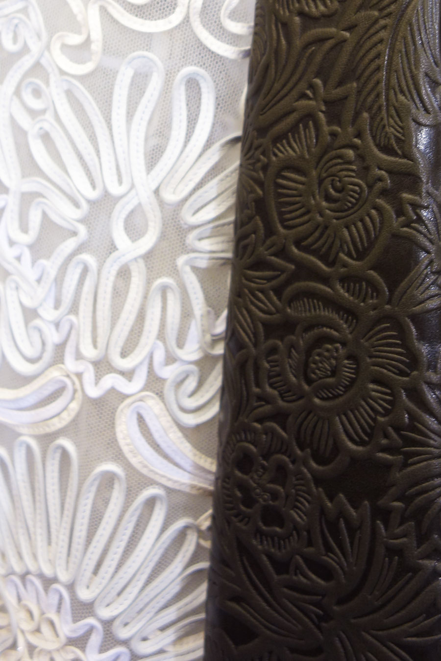 Du cuir tressé, embossé, découpé au laser, de la dentelle de fils de cuirs sur tulle, des entrelacs de napa, des fleurs, des oiseaux, des galons, de la souplesse inattendue, une légèreté qui tient du miracle… c’est fou. Ça pèse un gramme, c’est aéré et aérien, doux au toucher… on a envie de tout embarquer.