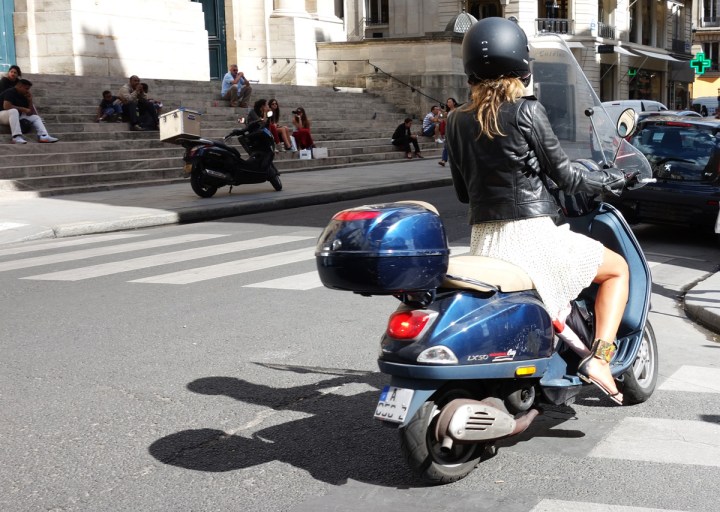 Sandales ethniques brodées sur chevillettes, bronzage caramel du mollet galbé, jupe à pois qui vole, et vous le verrez plus bas, parfait perfecto de la cool attitude, cheveux messy s’échappant du casque noir, gants de cuir…