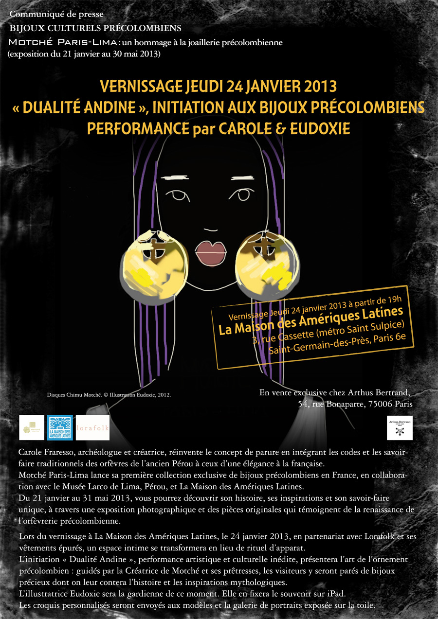 Pour ceux qui ne sont pas libres, l’exposition reste ouverte ensuite, avec des bijoux, mais aussi des photographies en provenance du Musée Larco de Lima… et puis je vous promets de vous faire un compte-rendu circonstancié de la soirée sur Chic & Geek.