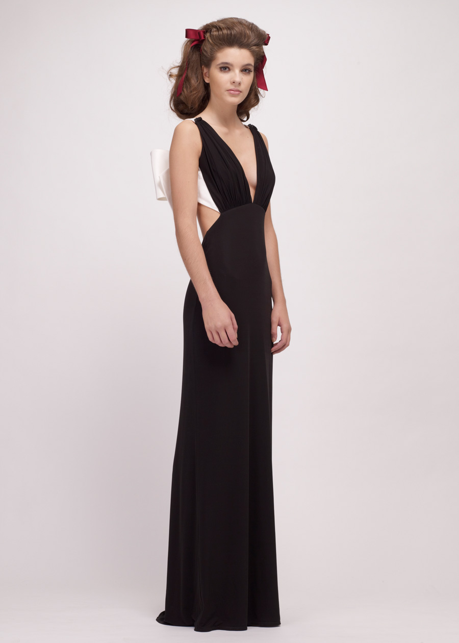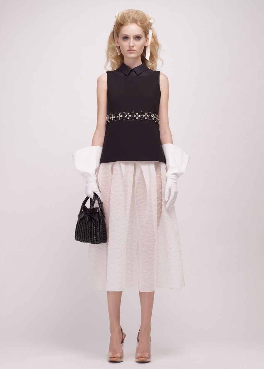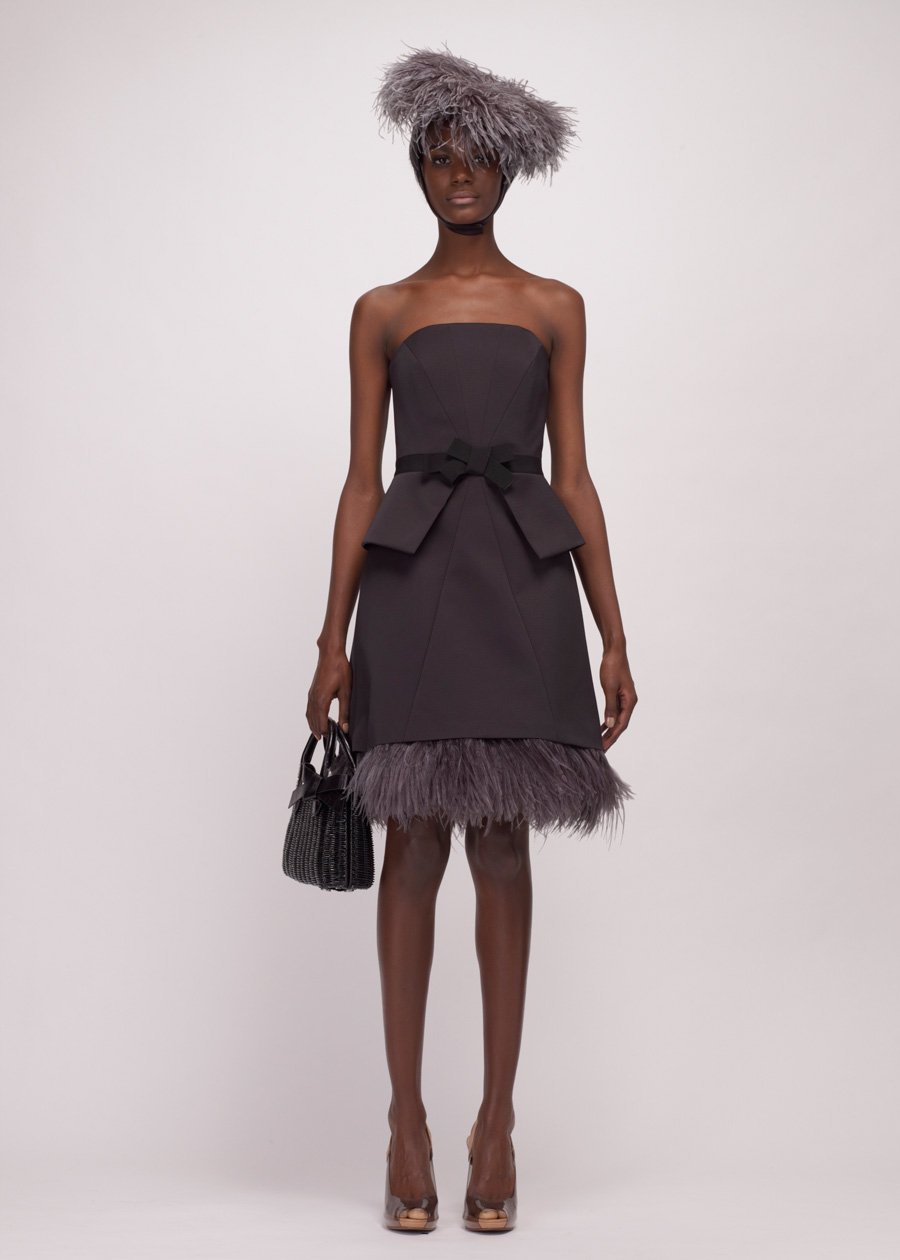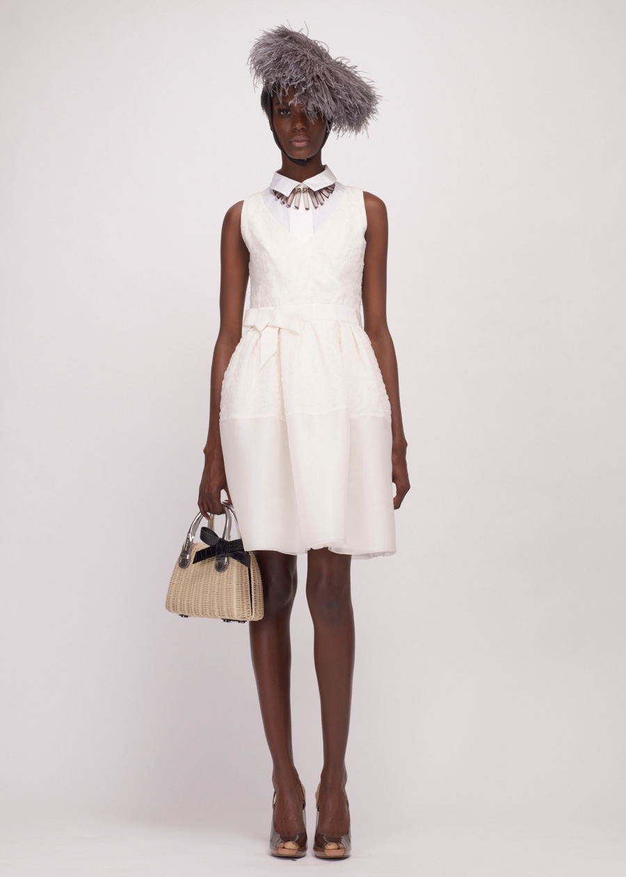 Dualité des couleurs, d’abord, puisque le noir et blanc donnent le tempo de cette nouvelle partition mode, ravivée sur certaines pièces par la profondeur du rouge grenat. Jeu de lignes et de matières, ensuite, puisque les coupes à l’architecture millimétrée renouvellent l’ADN sixties d’une Jackie Onassis prenant son envol. La légèreté du piqué de coton et le tombé du satin duchesse fusionnent quand l’organza cloqué et l’esprit dentelle de la guipure apportent une touche aérienne à la silhouette. Les plumes d’autruches s’invitent également dans une collection où le vêtement se transforme, jouant aussi bien avec les références du jour que le glamour du soir, les tenues d’extérieurs et les détails lingerie.