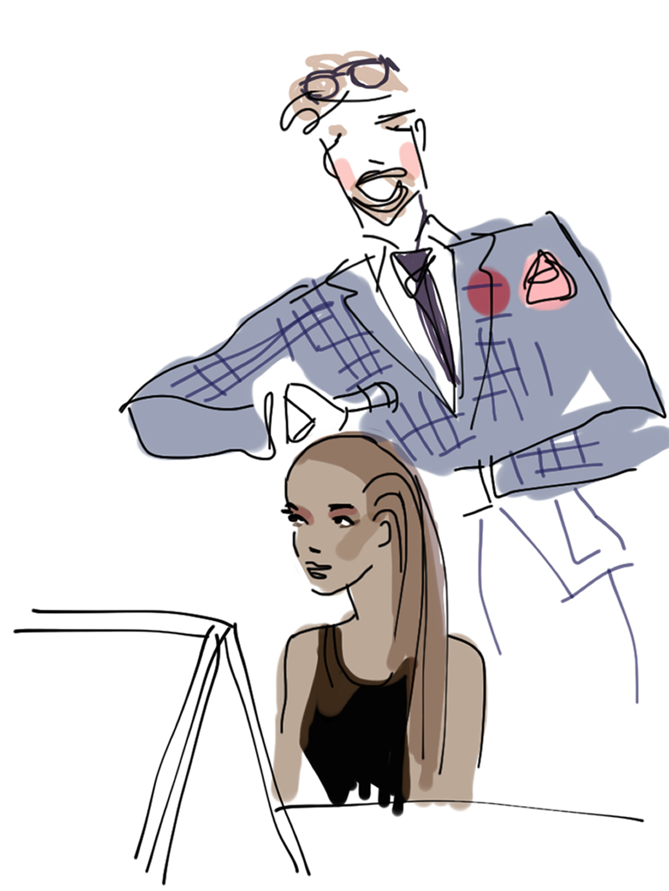 Je guette les scènes intéressantes. Je force mon crayon à dessiner plus vite que l’éclair. J’ai à peine quelques secondes avant de voir les modèles changer d’attitudes. J’attrape ce coiffeur soooo chic avec son costume à carreaux, sa petite fleur rouge au revers. Il a un côté gentleman au sèche-cheveux, je l’aurais tout aussi bien vu au fumoir avec un cigare.