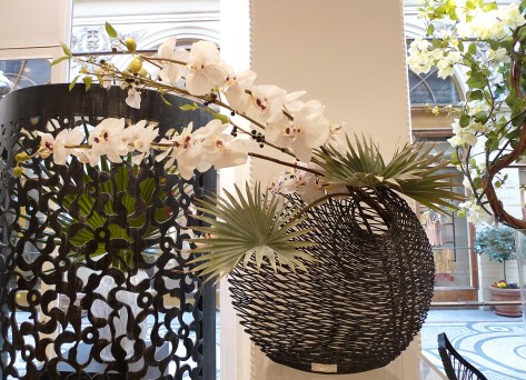 5. Je n’habitais pas très loin du magasin principal rue du Bac au temps de ma jeunesse – il y a une quinzaine d’années. Je passais devant pour aller à l’université. Cela fait donc longtemps que j’admire le travail d’Emilio Robba mais je connaissais pas les fausses palmes de camerops ! Je trouve que ces fausses fleurs marchent très bien pour rehausser un bouquet qui commence à faner ou qui s’est déplumé.